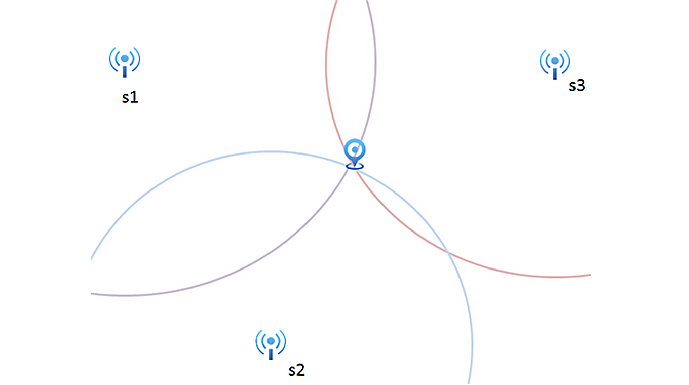 圖1-3是根據(jù)到各個基站的測距信息,以基站為中心畫圓,就可以得到一個交點(diǎn),交點(diǎn)就是標(biāo)簽的位置。