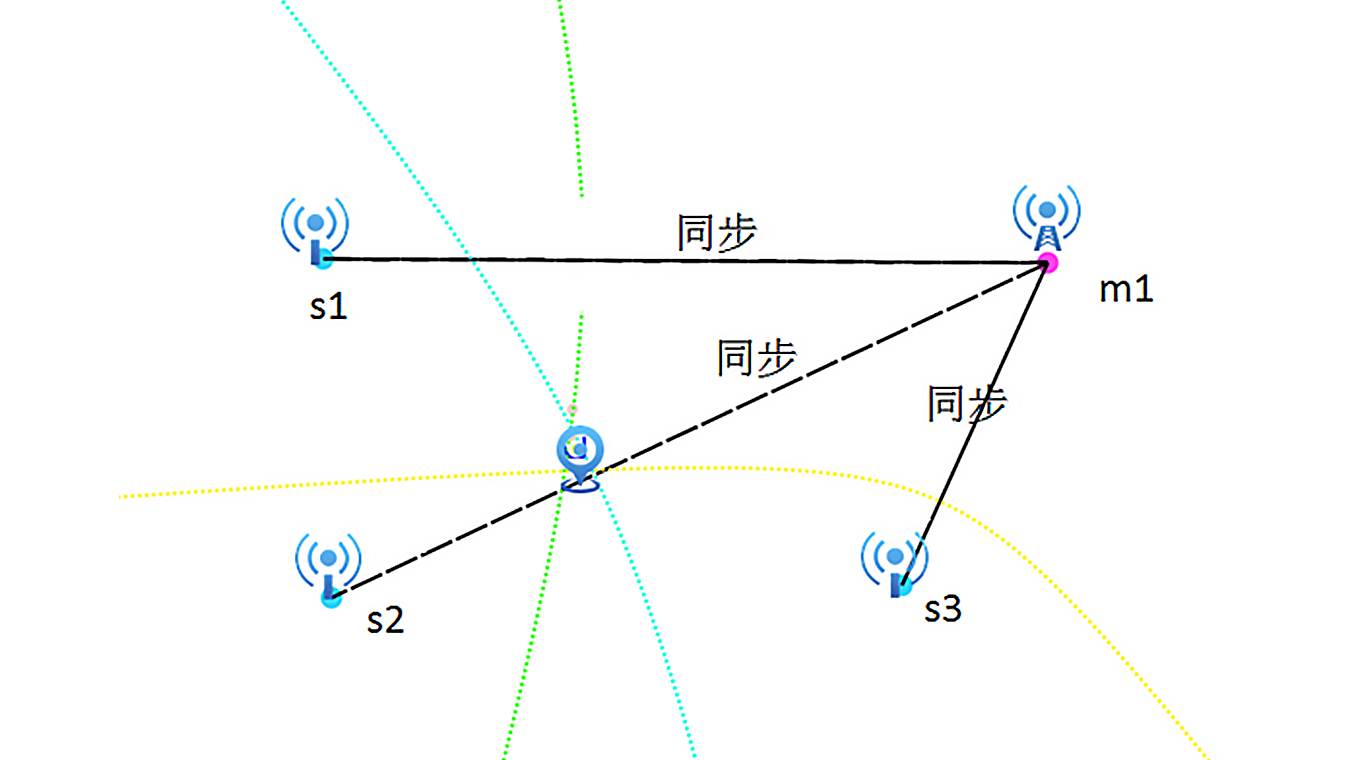 標(biāo)簽將數(shù)據(jù)包發(fā)送到被基站覆蓋的區(qū)域內(nèi),附近的所有基站都會收到標(biāo)簽的無線信號,但不會返回任何無線信號。由于基站與標(biāo)簽的距離間隔不同,因此消息在不同的時刻到達(dá)每個基站。這些時間差乘以空間中恒定的光速得到標(biāo)簽和基站之間的距離差,這樣就可以形成多點(diǎn)定位計算的基礎(chǔ),從而確定標(biāo)簽的相對坐標(biāo)。另外該技術(shù)的決定性因素是所有基站必須被同步。