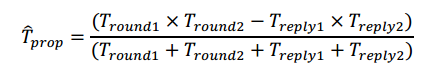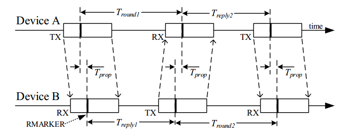 以下圖中最常用的3消息雙向測距方法為例,標(biāo)簽和基站的測距流程如下圖所看到,標(biāo)簽可以看做設(shè)備A(Device A),基站可以看做設(shè)備B(Device B),設(shè)備A主動發(fā)起第一次測距消息,設(shè)備B響應(yīng),得到4個時間戳,設(shè)備A等待Treply2之后再發(fā)起,設(shè)備B接收,再得到2個時間戳。因此可以得到如下四個時間差: