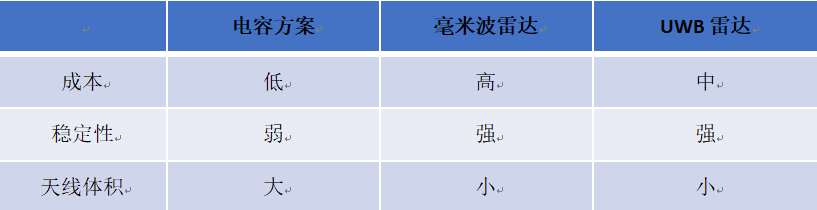 毫米波雷達是一種備選替代方案,通過對毫米波雷達回波的分析,可以有效檢測踢腿的動作。并且毫米波不受周邊電磁環(huán)境的干擾,雨水的影響也不大。目前車載毫米波腳踢尾箱雷達最大的問題是價格較昂貴(相比電容方案和UWB雷達方案)。UWB雷達提供了另一種選項。穩(wěn)定性足夠高(相比電容方案),成本適中(比電容方案貴,比毫米波方案便宜),低功耗(低于毫米波雷達)。